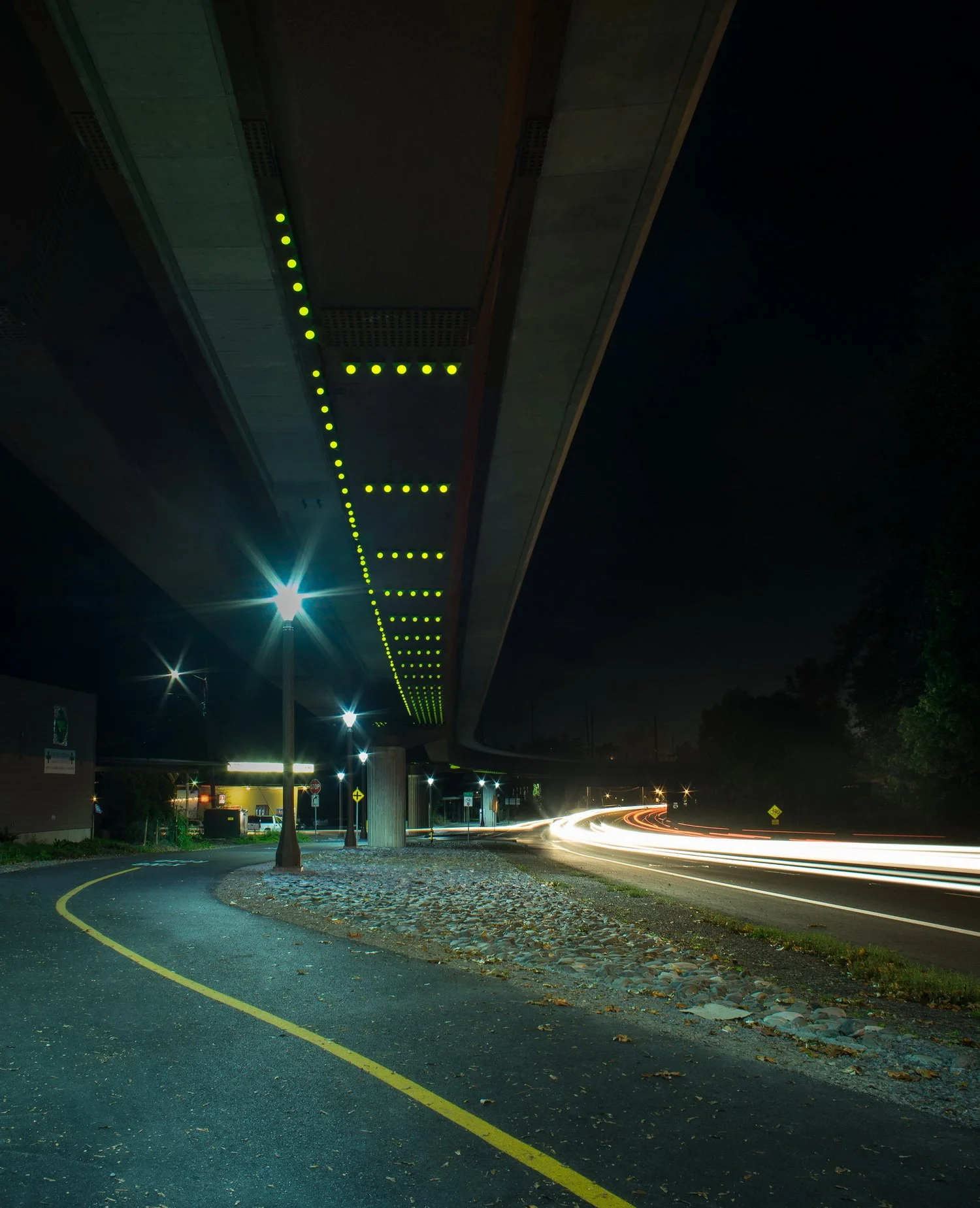 A 1,700-foot field of light beneath a bridge, Flow-Zone maps the invisible currents of the city. Two thousand green aluminum fins ripple across the underside of TriMet’s Orange Line overpass, turning traffic, wind, and light into a continuous motion field.